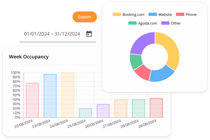 Keep track of your hotel with comprehensive dashboards and generate expensive reports with valuable statistics about occupancy, revenue, income sources and more.