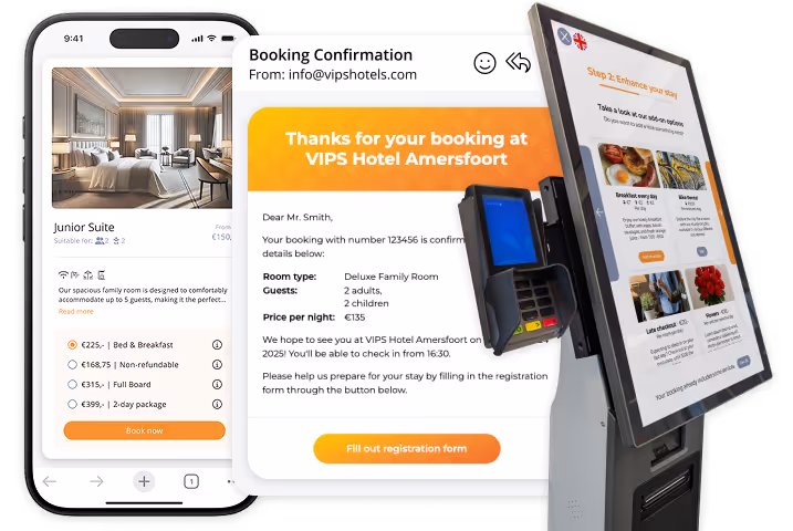 Put your hotel's brand on display throughout the guest journey with a fully customizable booking engine, limitless automated guest communication options and VIPS Kiosk, all in your style.
